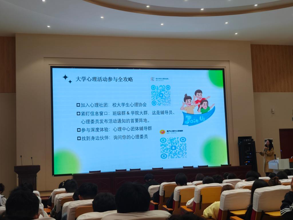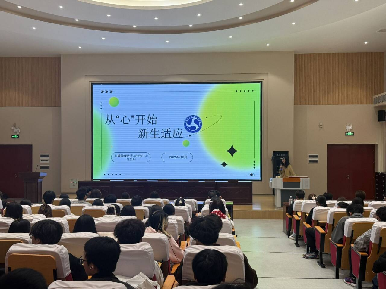 2025年10月10日晚,由心理中心主办的“新生适应”主题讲座在思政研修基地顺利举行。本次活动由心理中心专职教师汪老师主讲,围绕常见适应问题、心理调适方法及学校心理中心资源等内容展开,旨在帮助2025级新生更好地应对大学阶段的转变与挑战,吸引百余名新生参与。